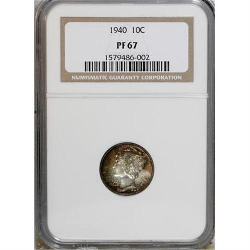 <B>1940 10C PR67 NGC.</B></I> A crisply struck and richly toned Superb Gem representative of this later proof Mercury issue, luminous beneath rich watermelon-red and silver-gray patina. Highly appealing. NGC has graded 35 finer representatives (12/07).<BR><BR><B>Coin Engraver:</B> Adolph A. Weinman<BR><BR><b>Shipping:</b> Coins & Currency (<a target="_blank" href="http://www.heritageauctions.com/common/shipping.php">view shipping information</a>)