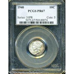 1940 10C PR67 PCGS. Speckles of multicolored tonin <B>1940 10C PR67 PCGS.</B></I> Speckles of multicolored toning occupy each side. Exquisitely struck, and lovingly preserved, pristine surfaces. <BR><BR><B>Important notice:</B> Heritage usually auctions material at the rate of 200-250 lots per hour. On some occasions eBay Live bid software or the Internet may not be able to keep up with the pace of the auction. We recommend placing a realistic absentee bid now as insurance to avoid disappointment. Occasionally the auctioneer may eliminate or reject an eBay Live bid, and the auctioneer may also reopen a lot after the close of the eBay live bidding (usually because we missed an audience bid), and may reject your bid even if it shows you as the winning bidder. By bidding via eBay Live, you agree that Heritage may award the lot to another bidder at its sole discretion under the circumstances described above or any other reasonable circumstances. Since eBay bids are not shown to us until we open the lot on the floor, we treat those bids just like floor bids. In most cases the floor responds before the eBay bid is presented to us, due to Internet lag time, so for consistency we have made it a policy that floor bids are always considered first over tie eBay live bids. Also please note that all Heritage lots purchased through eBay Live carry a 20% Buyer's Premium. Please make sure you read the Terms and Conditions before you bid. This lot is being auctioned in conjunction with a live floor auction by Heritage Galleries & Auctioneers. All final auction and invoice information will be supplied by Heritage Galleries & Auctioneers, and all other information should be considered preliminary. Lot:5847