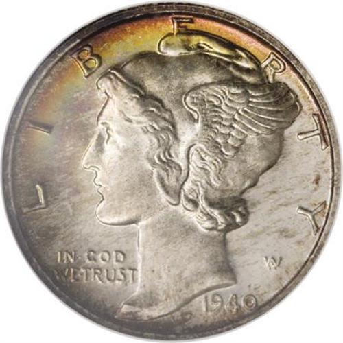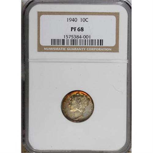 <B>1940 10C PR68 NGC.</B></I> The devices on both sides offer needle-sharp detail, and the fields gleam beneath thin champagne-gray patina. Deeper gold and ruby patina graces the upper obverse rim as well. A lovely representative of this short-lived proof series. NGC has graded just one numerically finer specimen, and PCGS acknowledges none (5/07).<BR><BR><b>Shipping:</b> Coins & Currency (<a target="_blank" href="http://www.heritageauctions.com/common/shipping.php">view shipping information</a>)