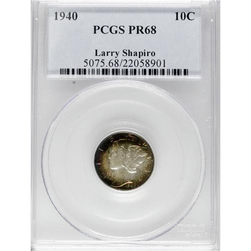 <B>1940 10C PR68 PCGS.</B></I> Ex: Larry Shapiro. The deep golden-brown color of the obverse periphery give way to a variety of rainbow-grade colors. Untoned at the centers with the reverse ringed in similar colors near the edge. An exquisitely preserved example of the proof Mercury dime series, which would last only two more issues before the exigencies of war forced its cancellation. Population: 18 in 68, 0 finer (4/07).<BR><BR><b>Shipping:</b> Coins & Currency (<a target="_blank" href="http://www.heritageauctions.com/common/shipping.php">view shipping information</a>)