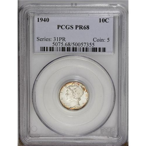 <B>1940<10C> PR68 PCGS.</B></I> Ruby-red, honey, and apple-green colors endow the obverse border. A razor-sharp and pristine Superb Gem that must be seen in person to be fully appreciated. A somewhat better proof issue, about half the mintage of the 1942. Population: 18 in 68, 0 finer (3/06).