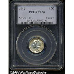 <B>1940<10C> PR68 PCGS.</B></I> A gloriously preserved specimen that appears essentially as struck beneath streaky golden and silver-gray patina. Population: 18 in 68, 0 finer (3/04). <BR><BR><B>Important notice:</B> Heritage usually auctions material at the rate of 200-250 lots per hour. On some occasions eBay Live bid software or the Internet may not be able to keep up with the pace of the auction. We recommend placing a realistic absentee bid now as insurance to avoid disappointment. Occasionally the auctioneer may eliminate or reject an eBay Live bid, and the auctioneer may also reopen a lot after the close of the eBay live bidding (usually because we missed an audience bid), and may reject your bid even if it shows you as the winning bidder. By bidding via eBay Live, you agree that Heritage may award the lot to another bidder at its sole discretion under the circumstances described above or any other reasonable circumstances. Since eBay bids are not shown to us until we open the lot on the floor, we treat those bids just like floor bids. In most cases the floor responds before the eBay bid is presented to us, due to Internet lag time, so for consistency we have made it a policy that floor bids are always considered first over tie eBay live bids. Also please note that all Heritage lots purchased through eBay Live carry a 20% Buyer's Premium. Please make sure you read the Terms and Conditions before you bid.