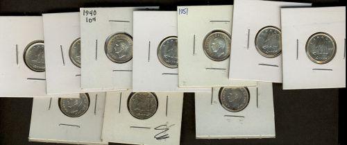 1940, 1942, 1943, 1945, 1946, 1947 ML, 1949, 1950, 1951, 1952. A nice lot of 10 pieces. Grades vary from MS-60 to MS-63.