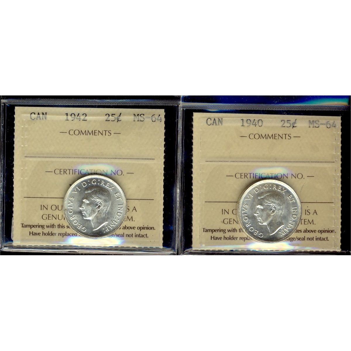 1940 & 1942 25¢ ICCS MS64. Lot of 2 coins.