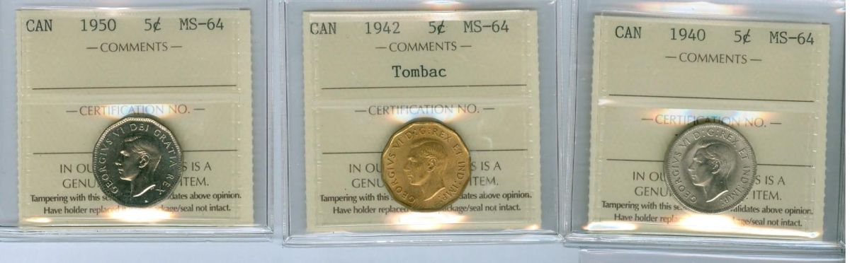 1940, 1942 Tombac, 1950 5¢ Lot of 3 ICCS graded coins, all I
