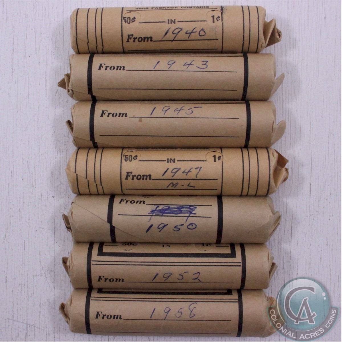 1940,1943,1945,1947 Maple Leaf,1950,1952, and 1958 Canada 1-cent Rolls of 50pcs in Uncirculated or + (MS60 to MS63) condition (some coins will be toned) 7 rolls