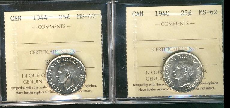 1940 & 1944 25¢ ICCS MS62. Lot of 2 coins.