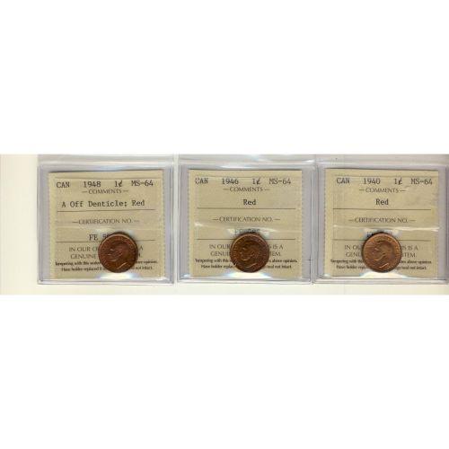 1940, 1946 and 1948 1¢ ICCS MS64 Red. Lot of 3 coins all full red. 1948 designated as A Off Denticle.