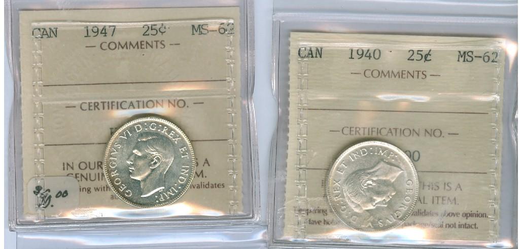 1940 & 1947 25¢. Lot of two coins both ICCS MS62. Both white in colour.