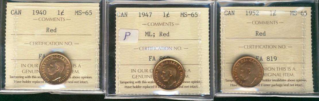 1940, 1947ML & 1952 1¢ ICCS MS65RD. Lot of 3 coins.