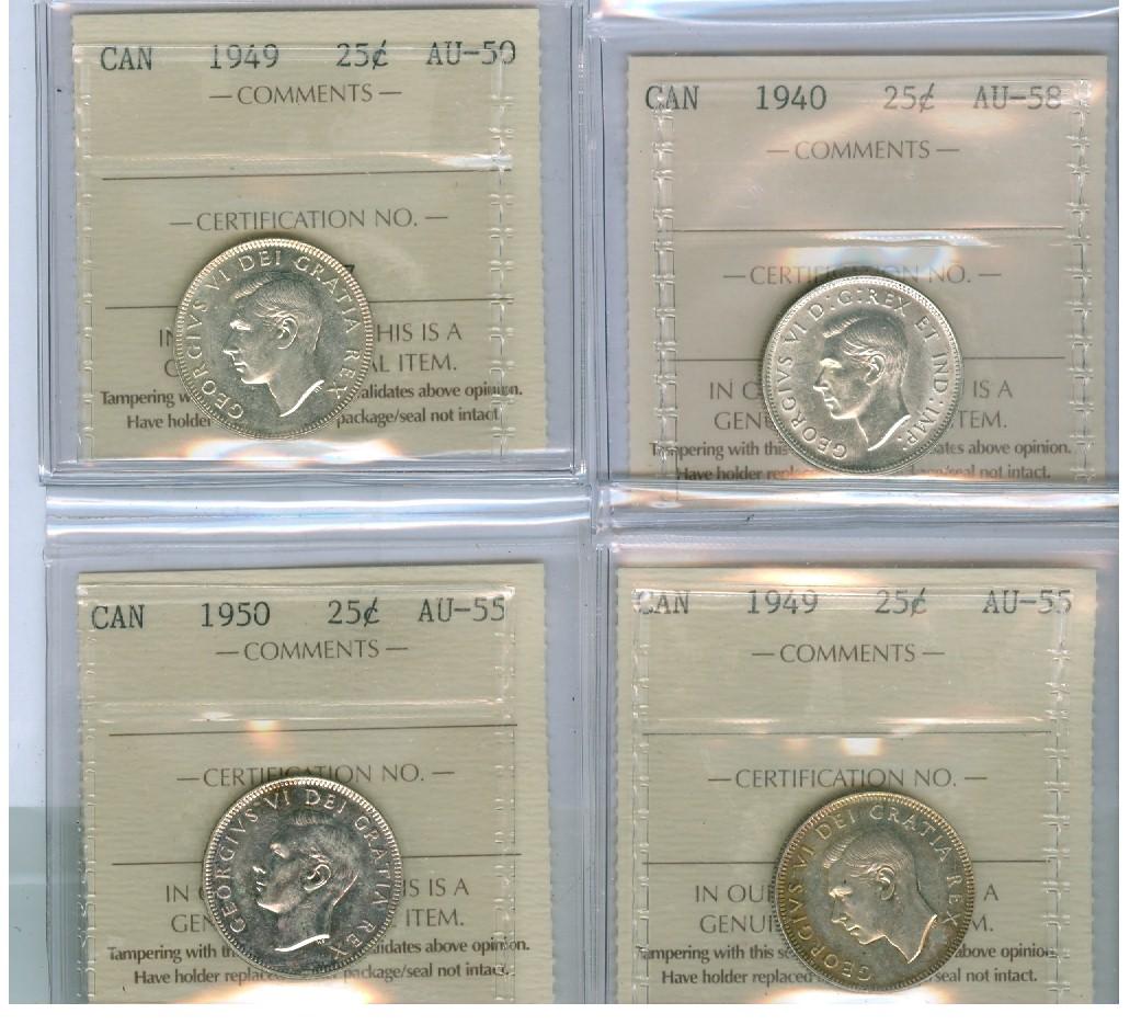 1940 - 1950 25¢. Lot of four coins all ICCS certified. Includes 1940 AU58, 1949 AU50, 1949 AU55 and 1950 AU55.