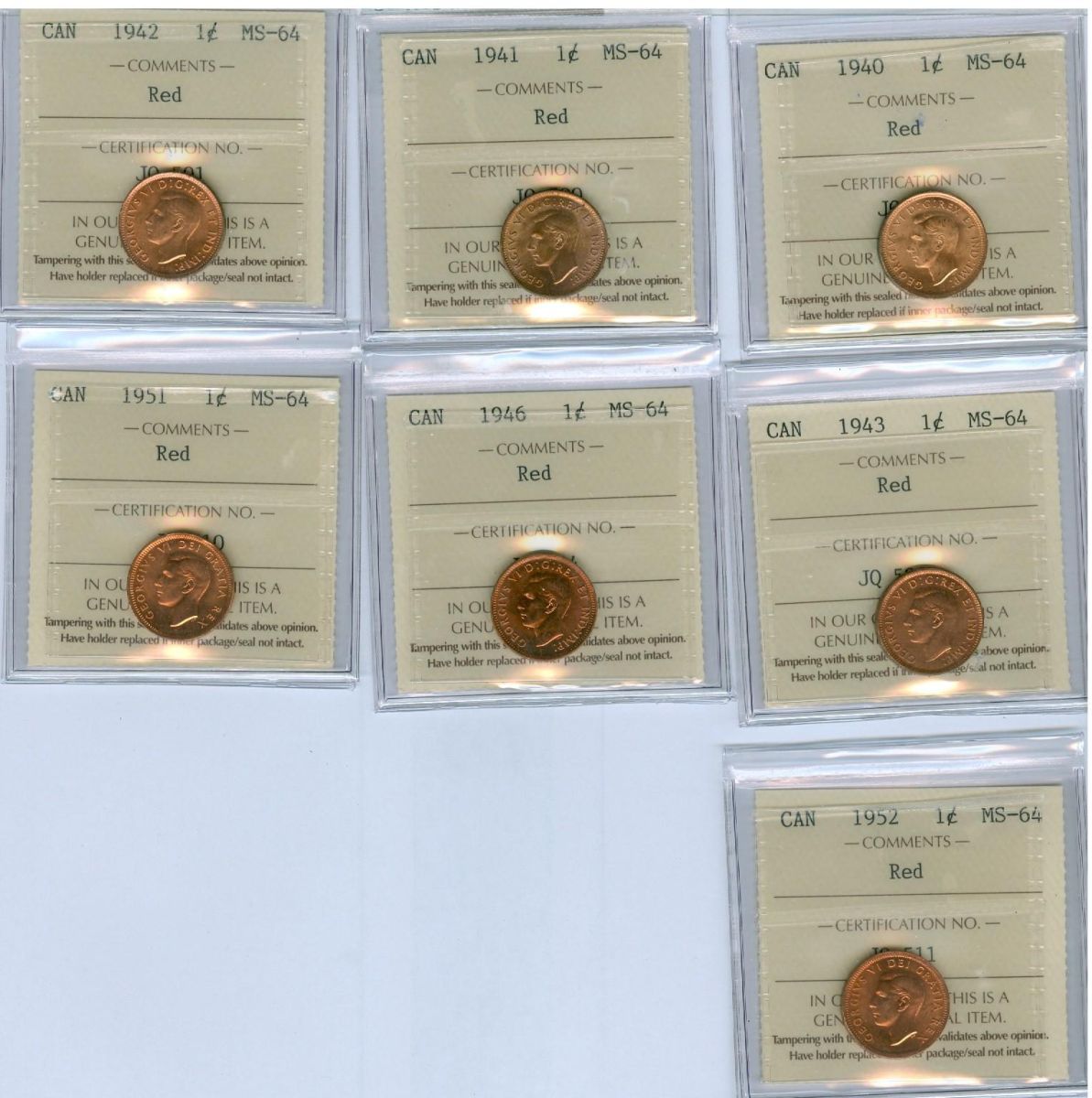 1940 - 1952 1¢. Lot of 7 coins all ICCS MS64RD. Includes 1940, 1941, 1942, 1943, 1946, 1951 and 1952.