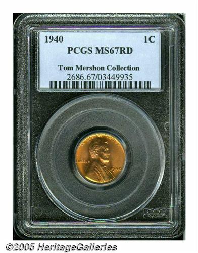 <B>1940<1C> MS67 Red PCGS.</B></I> Gleaming and glistening with intense silky luster that enhances the bold yellow and bright orange hues. Fully struck and very clean, with a bit of chatter on Lincoln's face.<BR><I>From The Tom Mershon #2 All-Time PCGS Registry Set of Lincoln Wheat Cents.</B></I>