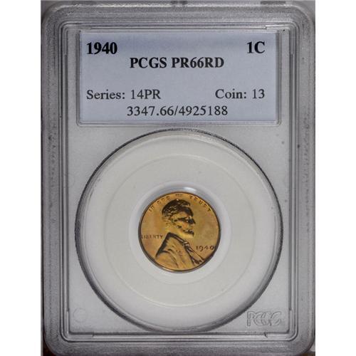 <B>1940<1C> PR66 Red PCGS.</B></I> Sharply detailed and well preserved with a flashy, deeply reflective appearance and variegated milky-green and golden-red coloration on both sides.