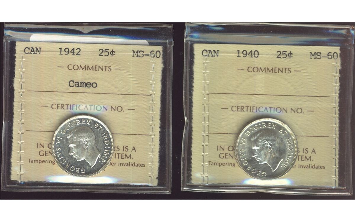 1940 25¢ & 1942 ICCS MS60. Lot of 2 coins with 1942 Cameo.