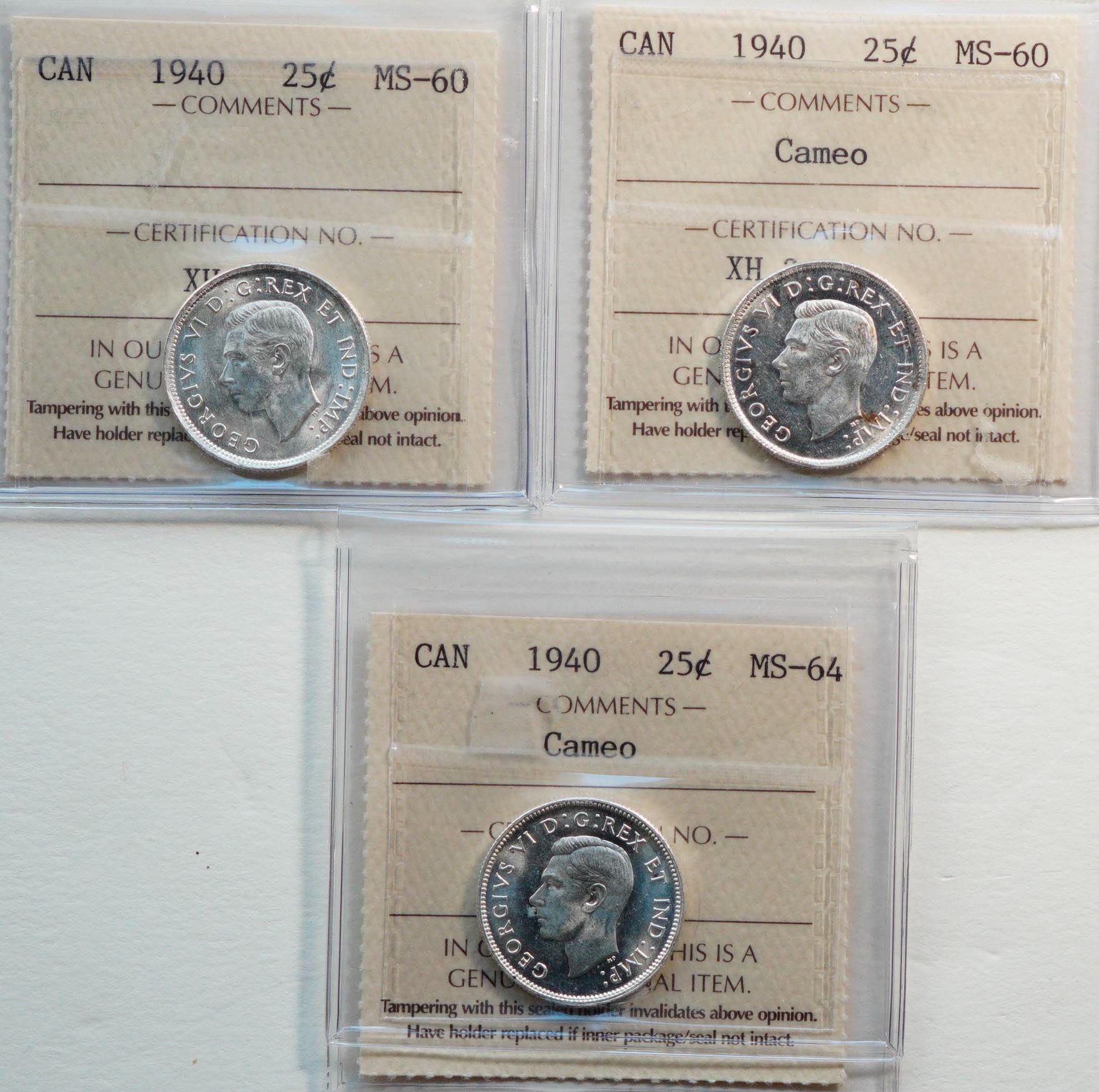 1940 25¢ Lot of 3 coins ICCS grated Mint State-60 to Choice Mint State-64