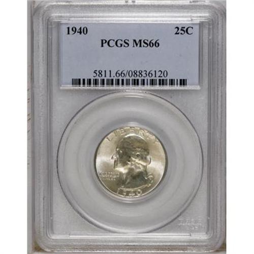 <B>1940 25C MS66 PCGS.</B></I> PCGS Population (394/71). NGC Census: (386/153). Mintage: 35,715,248. Numismedia Wsl. Price for NGC/PCGS coin in MS66: $100. (#5811)<BR><BR><b>Shipping:</b> Coins & Currency (<a target="_blank" href="http://www.heritageauctions.com/common/shipping.php">view shipping information</a>)
