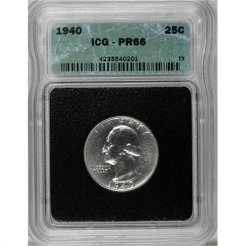 <B>1940 25C PR66 ICG.</B></I> NGC Census: (444/190). PCGS Population (594/146). Mintage: 11,246. Numismedia Wsl. Price for NGC/PCGS coin in PR66: $255. (#5979)<BR><BR><B>Coin Engraver:</B> John Flanagan<BR><BR><b>Shipping:</b> Coins & Currency (<a target="_blank" href="http://www.heritageauctions.com/common/shipping.php">view shipping information</a>)