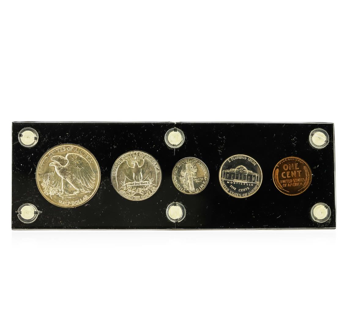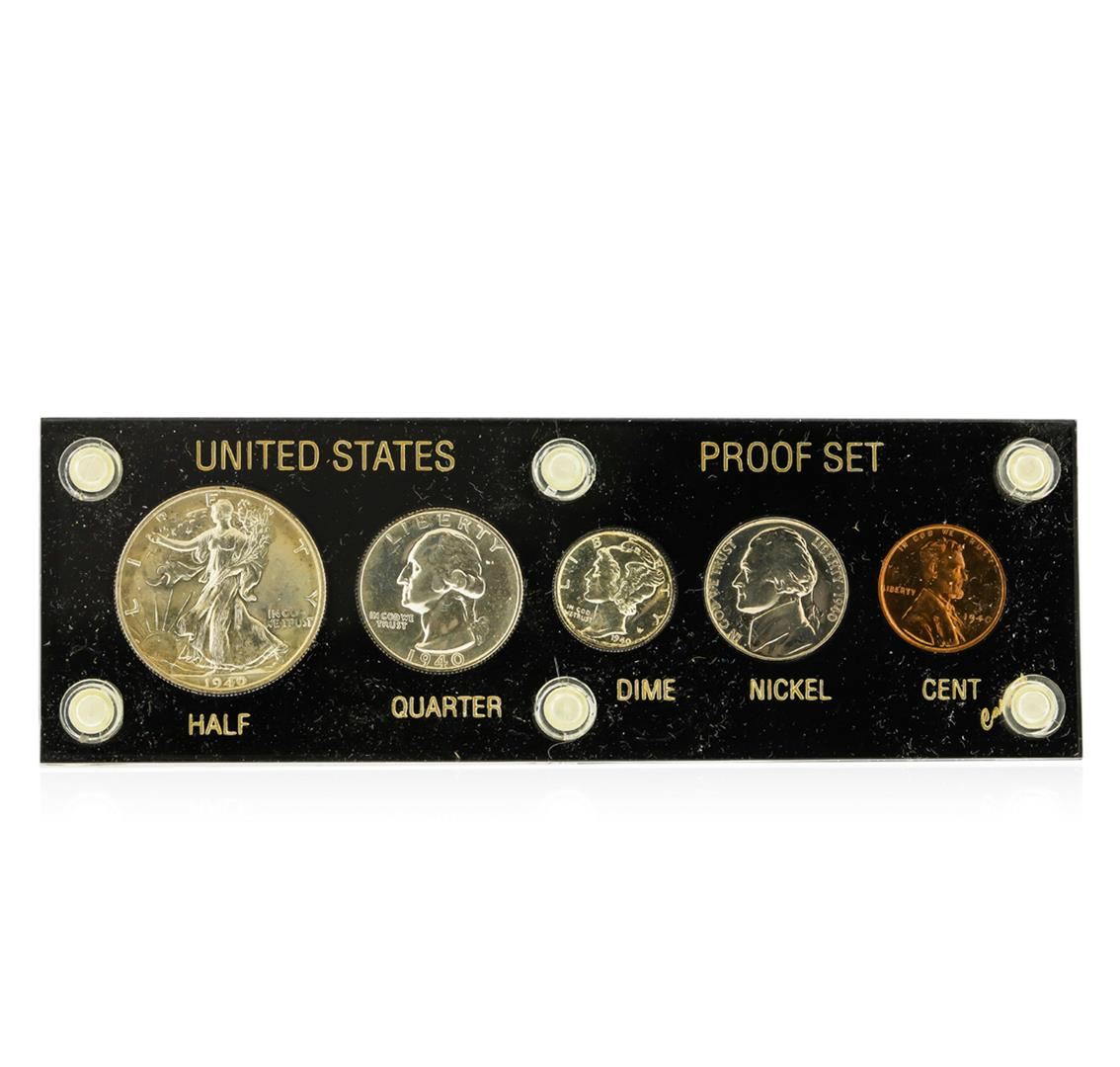 This 1940 (5) Coin Proof Set includes the following coins: 1940 Walking Liberty Half Dollar, 1940 Washington Quarter, 1940 Mercury Dime, 1940 Jefferson Nickel, and a 1940 Lincoln Wheat Cent.