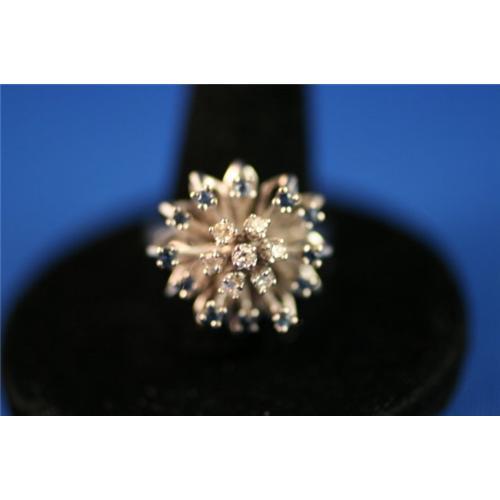 This is a delicate yet dramatic cocktail or dinner ring from the 1940's. It features 7 clear, bright diamonds, totaling about 12 points, surrounde by petals of white gold, holding twelve light blue sapphires, of about a point each. The ring sits almost one-half inch above the finger. It weighs 4.4 grams and is a size 7 (sizable by me or by your jeweler).