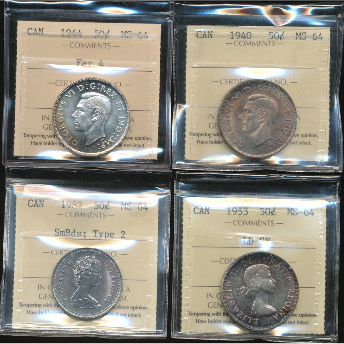 1940 50¢, 1944 Fr, 1953 LD SF & 1982 SmBds T2 ICCS MS64.  Lot of 4 coins.