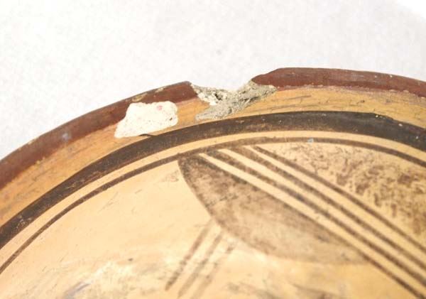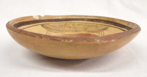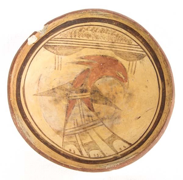 1940-50 Native American Hopi Avian Design Pottery Bowl, measures 6''D x 1.5''H, has overpaint and 2 chips on rim