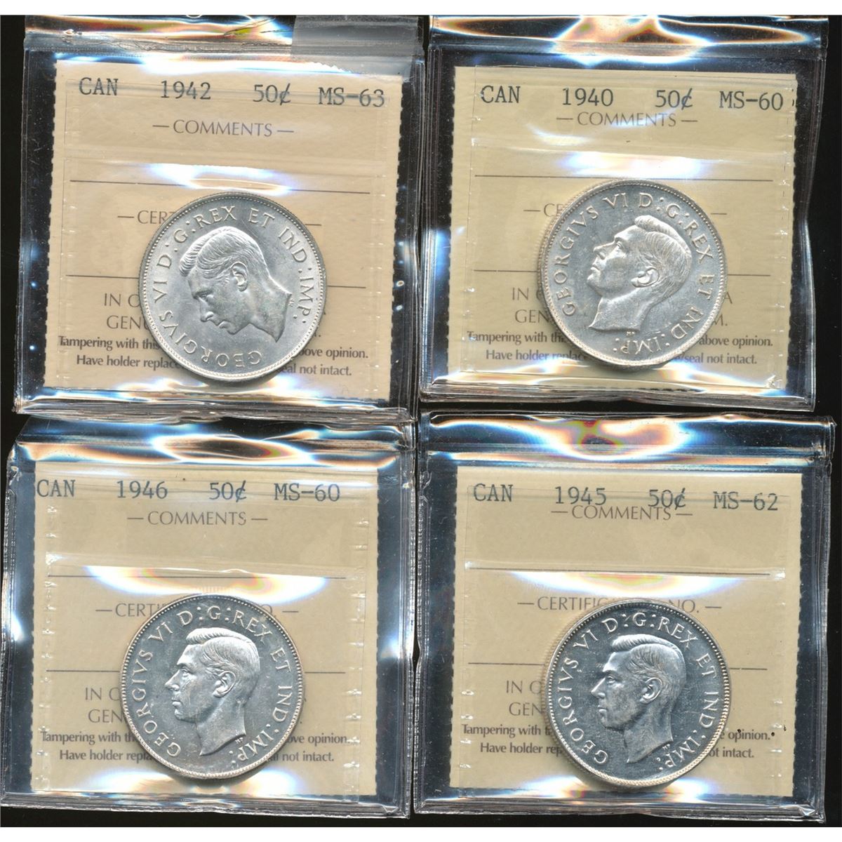 1940 50¢ MS60, 1942 MS63, 1945 MS62 & 1946 MS60. Lot of 4 coins all ICCS graded.