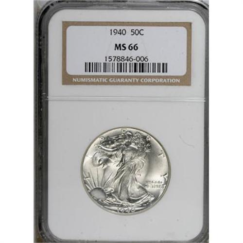 <B>1940 50C MS66 NGC.</B></I> NGC Census: (645/180). PCGS Population (870/191). Mintage: 9,167,279. Numismedia Wsl. Price for NGC/PCGS coin in MS66: $240. (#6609)<BR><BR><B>Coin Engraver:</B> Adolph A. Weinman<BR><BR><b>Shipping:</b> Coins & Currency (<a target="_blank" href="http://www.heritageauctions.com/common/shipping.php">view shipping information</a>)