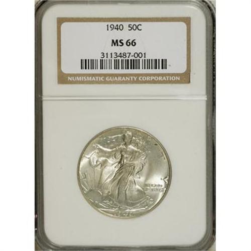<B>1940 50C MS66 NGC.</B></I> NGC Census: (645/180). PCGS Population (871/191). Mintage: 9,167,279. Numismedia Wsl. Price for NGC/PCGS coin in MS66: $240. (#6609)<BR><BR><B>Coin Engraver:</B> Adolph A. Weinman<BR><BR><b>Shipping:</b> Coins & Currency (<a target="_blank" href="http://www.heritageauctions.com/common/shipping.php">view shipping information</a>)