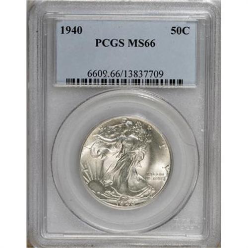<B>1940 50C MS66 PCGS.</B></I> PCGS Population (864/188). NGC Census: (639/179). Mintage: 9,167,279. Numismedia Wsl. Price for NGC/PCGS coin in MS66: $240. (#6609)<BR><BR><B>Coin Engraver:</B> Adolph A. Weinman<BR><BR><b>Shipping:</b> Coins & Currency (<a target="_blank" href="http://www.heritageauctions.com/common/shipping.php">view shipping information</a>\)
