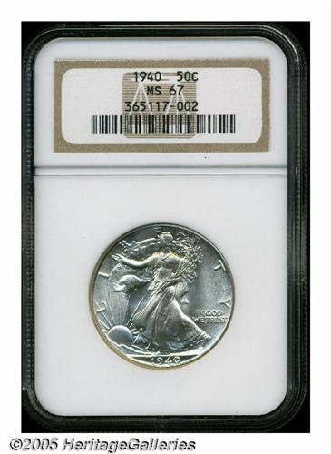 <B>1940<50C> MS67 NGC.</B></I> Sharply struck with nearly full brilliance. The obverse has a trace of pale champagne toning at the top, while the reverse has an iridescent toning spot on the rim at 11 o'clock. Only a few finer examples have been certified.