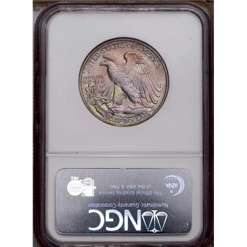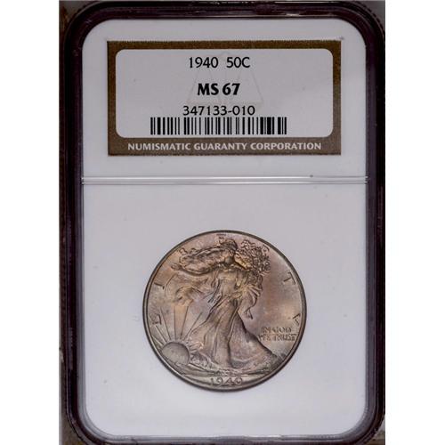 <B>1940<50C> MS67 NGC.</B></I> The phenomenal toning on each side is a breathtaking melange of heather, apricot, and ice-blue, with the reverse adding a smattering of lemon-yellow. The luster is radiant underneath the translucent toning, and few distractions of any sort are noted. NGC has graded 16 specimens finer (4/06).