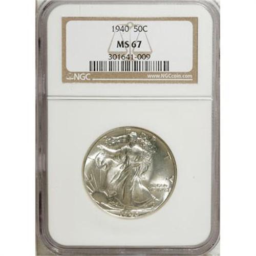 <B>1940 50C MS67 NGC.</B></I> NGC Census: (166/15). PCGS Population (170/20). Mintage: 9,167,279. Numismedia Wsl. Price for NGC/PCGS coin in MS67: $650. (#6609)<BR><BR><B>Coin Engraver:</B> Adolph A. Weinman<BR><BR><b>Shipping:</b> Coins & Currency (<a target="_blank" href="http://www.heritageauctions.com/common/shipping.php">view shipping information</a>\)