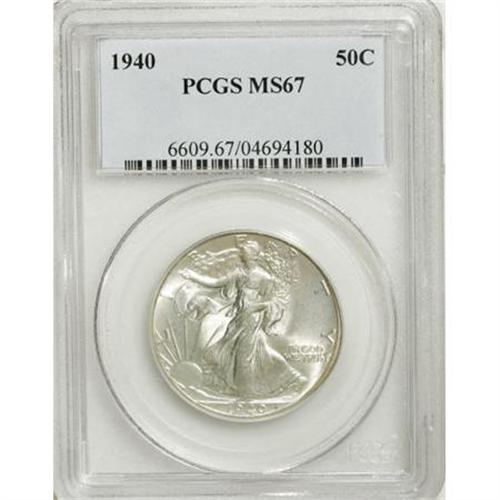 <B>1940 50C MS67 PCGS.</B></I> PCGS Population (169/19). NGC Census: (164/15). Mintage: 9,167,279. Numismedia Wsl. Price for NGC/PCGS coin in MS67: $650. (#6609)<BR><BR><B>Coin Engraver:</B> Adolph A. Weinman<BR><BR><b>Shipping:</b> Coins & Currency (<a target="_blank" href="http://www.heritageauctions.com/common/shipping.php">view shipping information</a>\)