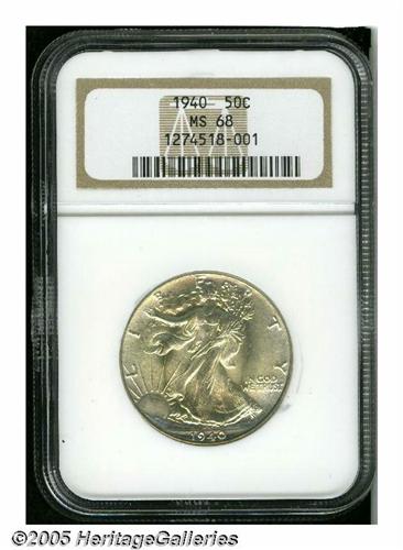 <B>1940<50C> MS68 NGC.</B></I> A conditionally rare survivor of this otherwise plentiful P-mint Half Dollar, both sides have survived with little evidence of coin-to-coin contact. Crescents of powder-blue iridescence frame golden tinged centers and further highlight the fully brought up devices. Beautifully frosted with some interesting die polish lines (as struck, and not uncommon for the type) in the right obverse field. Population: 13 in 68, 1 finer (6/05).<BR><I>From The Robert Moreno Collection.</B></I>