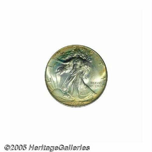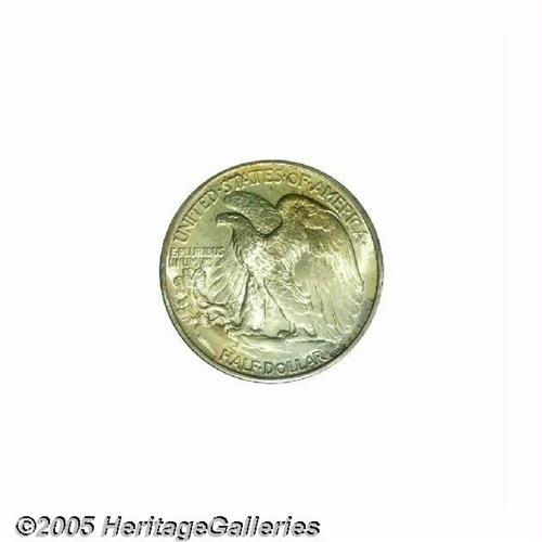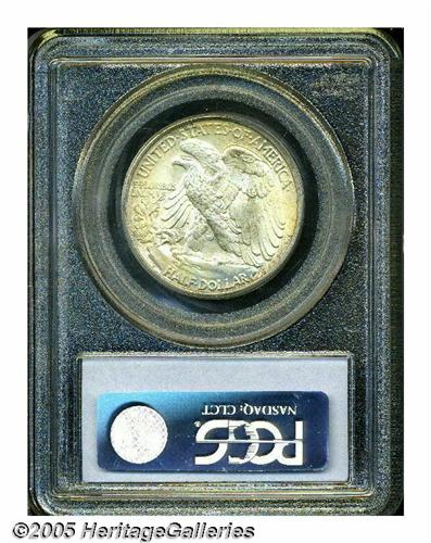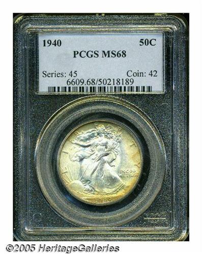 <B>1940<50C> MS68 PCGS.</B></I> This rather amazing Superb Gem is fully struck, with seemingly pristine surfaces which are lustrous and exquisitely toned in "oil slick" colors which include pastel shades of green, yellow, and crimson-red, among others. A small abrasion appears on the eagle's wing, and faint die polish lines, as struck, are present in the upper obverse regions. Population: 17 in 68, 0 finer (5/05).
