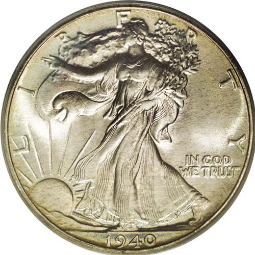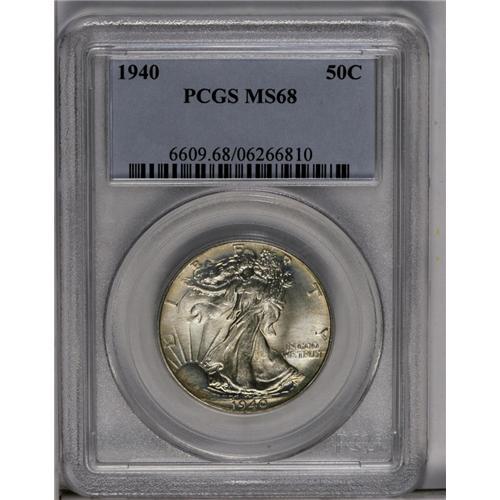 <B>1940<50C> MS68 PCGS.</B></I> Well struck and highly lustrous with amazingly clean surfaces. A light golden patina near the obverse borders is mingled with pastel aqua and pink-red coloration. The 1940 Walking Liberty half dollar is right up there among the best produced issues in the series, perhaps matched only by the P-mint issues from the preceding and following year. Population: 19 in 68, 0 finer (5/06).