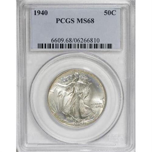 <B>1940 50C MS68 PCGS.</B></I> Well struck and highly lustrous with amazingly clean surfaces. A light golden patina near the obverse borders is mingled with pastel aqua and pink-red coloration. The 1940 Walking Liberty half dollar is right up there among the best-produced issues in the series, perhaps matched only by the P-mint issues from the preceding and following years. Population: 20 in 68, 0 finer (6/07). <BR><BR><B>Coin Engraver:</B> Adolph A. Weinman<BR><BR><b>Shipping:</b> Coins & Currency (<a target="_blank" href="http://www.heritageauctions.com/common/shipping.php">view shipping information</a>\)