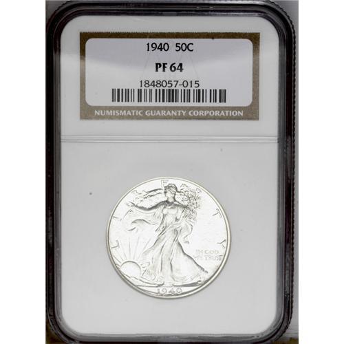 <B>1940<50C> PR64 NGC.</B></I> This example falls just short of Gem quality, and yet it certainly has the eye appeal of a higher grade coin. The surfaces are fully brilliant with deeply mirrored fields and reflective devices.<BR><I>From The Lewis (Tahoe) Collection.</B></I>