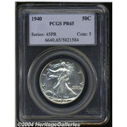 <B>1940<50C> PR65 PCGS.</B></I> Wisps of pearl-gray patina embrace the obverse fields of this well struck and nicely mirrored Gem. An original piece worthy of an advanced collection. <BR><BR><B>Important notice:</B> Heritage usually auctions material at the rate of 200-250 lots per hour. On some occasions eBay Live bid software or the Internet may not be able to keep up with the pace of the auction. We recommend placing a realistic absentee bid now as insurance to avoid disappointment. Occasionally the auctioneer may eliminate or reject an eBay Live bid, and the auctioneer may also reopen a lot after the close of the eBay live bidding (usually because we missed an audience bid), and may reject your bid even if it shows you as the winning bidder. By bidding via eBay Live, you agree that Heritage may award the lot to another bidder at its sole discretion under the circumstances described above or any other reasonable circumstances. Since eBay bids are not shown to us until we open the lot on the floor, we treat those bids just like floor bids. In most cases the floor responds before the eBay bid is presented to us, due to Internet lag time, so for consistency we have made it a policy that floor bids are always considered first over tie eBay live bids. Also please note that all Heritage lots purchased through eBay Live carry a 20% Buyer's Premium. Please make sure you read the Terms and Conditions before you bid. </span></font></tr></table></td></tr></table>