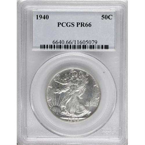 <B>1940 50C PR66 PCGS.</B></I> In their short time of production, the brilliant proofs of 1936-1942 only increased in popularity, and in 1940, all denominations had five-figure mintages. This moderately reflective silver-gray Gem offers crisp detail and strong visual appeal. The surfaces have an uncommonly clean appearance.<BR><BR><b>Shipping:</b> Coins & Currency (<a target="_blank" href="http://www.heritageauctions.com/common/shipping.php">view shipping information</a>)