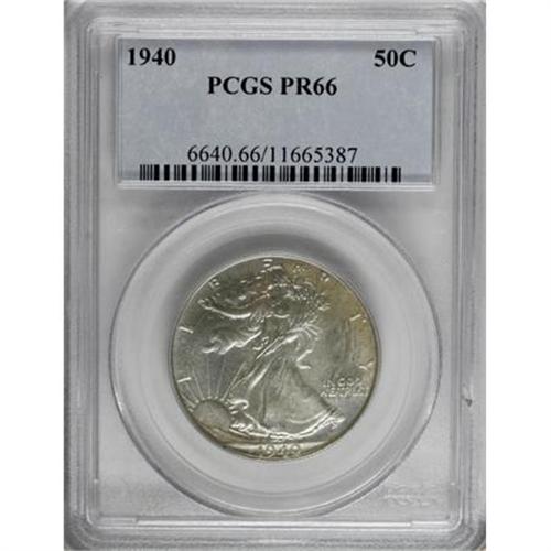 <B>1940 50C PR66 PCGS.</B></I> Crisply detailed with a moderate layer of silver-gray and olive patina over each side. The carefully preserved surfaces of this Premium Gem shine beneath the toning. A lovely example from the fifth of only seven proof Walking Liberty half issues.<BR><BR><B>Coin Engraver:</B> Adolph A. Weinman<BR><BR><b>Shipping:</b> Coins & Currency (<a target="_blank" href="http://www.heritageauctions.com/common/shipping.php">view shipping information</a>)