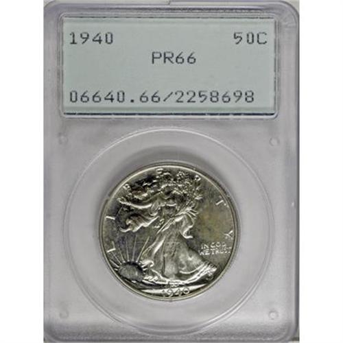 <B>1940 50C PR66 PCGS.</B></I> A gleaming and eminently appealing Premium Gem specimen, boldly impressed with carefully preserved surfaces. Delicate layers of gauzy silver-gray patina grace parts of the fields. Housed in a first-generation PCGS holder.<BR><I>From The Dennis Nelson Collection.</B></I><BR><BR><B>Coin Engraver:</B> Adolph A. Weinman<BR><BR><b>Shipping:</b> Coins & Currency (<a target="_blank" href="http://www.heritageauctions.com/common/shipping.php">view shipping information</a>)