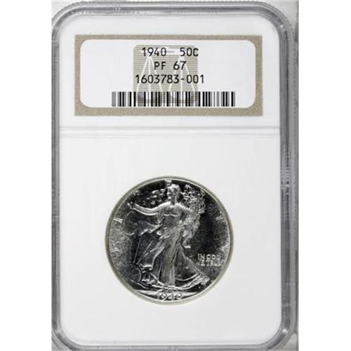 <B>1940 50C PR67 NGC.</B></I> This is a brilliant Superb Gem proof with amazingly clean surfaces and razor-sharp striking details. In terms of both eye appeal and overall technical merit, this is one of the finest specimens of the 1940 proof Walker that we have seen for several years. <BR><BR><B>Coin Engraver:</B> Adolph A. Weinman<BR><BR><b>Shipping:</b> Coins & Currency (<a target="_blank" href="http://www.heritageauctions.com/common/shipping.php">view shipping information</a>)