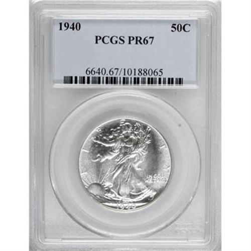 <B>1940 50C PR67 PCGS.</B></I> This crisply struck and virtually untoned Superb Gem has a deeply reflective obverse and seemingly bottomless mirrors on the reverse. A well-preserved specimen and a wonderful representative of this all-too-short proof series.<BR><BR><b>Shipping:</b> Coins & Currency (<a target="_blank" href="http://www.heritageauctions.com/common/shipping.php">view shipping information</a>)