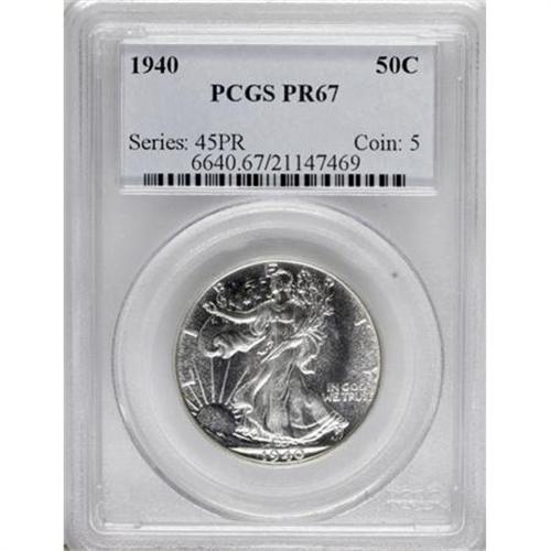 <B>1940 50C PR67 PCGS.</B></I> The surfaces sparkle with intense brilliance and the fields are deeply reflective on each side. A Superb and essentially perfect proof Walking Liberty half.<BR><BR><b>Shipping:</b> Coins & Currency (<a target="_blank" href="http://www.heritageauctions.com/common/shipping.php">view shipping information</a>)