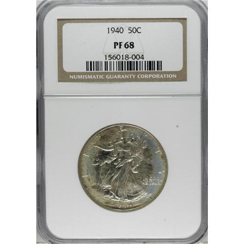 <B>1940 50C PR68 NGC.</B></I> Essentially a perfect type coin, each side has a light accent of pale, hazy lilac and rose patina that is most attractive. The surfaces are predictably free from the contact marks that are so often seen on proofs of this design. Simply an awesome coin and one of the finest proof Walkers we have seen of any date. Census: 45 in 68, 0 finer (4/07).<BR><BR><b>Shipping:</b> Coins & Currency (<a target="_blank" href="http://www.heritageauctions.com/common/shipping.php">view shipping information</a>)