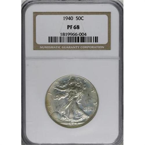 <B>1940 50C PR68 NGC.</B></I> This is a lovely Superb Gem proof, crisply struck and carefully preserved. As far as NGC is concerned, this is an unsurpassed 1940 Walking Liberty half. Only 45 examples have been so graded at that certification service, with none finer (6/07). Fully original golden-tan patina is seen in the borders, while the centers are more lightly toned. A bright, glossy finish is noticed in all areas, as are razor-sharp striking definition and eye appeal to spare.<BR><BR><BR><B>Coin Engraver:</B> Adolph A. Weinman<BR><BR><b>Shipping:</b> Coins & Currency (<a target="_blank" href="http://www.heritageauctions.com/common/shipping.php">view shipping information</a>\)