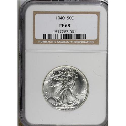 <B>1940 50C PR68 NGC.</B></I> The highly reflective surfaces of this PR68 Walker reveal an occasional wisp of barely discernible color under magnification, and are completely devoid of any blemishes. An exacting strike imparts exquisite definition to the design elements. This is an excellent example for a high-grade Walking Liberty proof collection. Census: 45 in 68, 0 finer (9/07).<BR><BR><B>Coin Engraver:</B> Adolph A. Weinman<BR><BR><b>Shipping:</b> Coins & Currency (<a target="_blank" href="http://www.heritageauctions.com/common/shipping.php">view shipping information</a>)