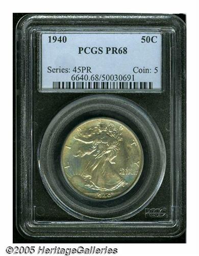 <B>1940<50C> PR68 PCGS.</B></I> This is an iridescent toned example with underlying mirrored fields and lustrous devices. It is on the verge of qualifying as a cameo example, and is extremely attractive. An important opportunity to acquire such a high grade coin. Neither grading service has seen a finer one. Population: 31 in 68, 0 finer (6/05).<BR><I>From The Robert Moreno Collection.</B></I>